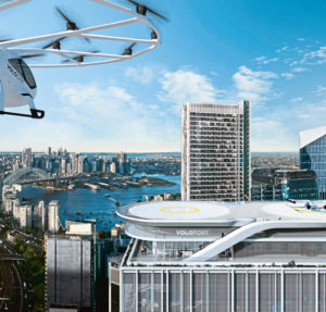 Simulation eines Volocity-Flugtaxis im Anflug auf einen Voloport.