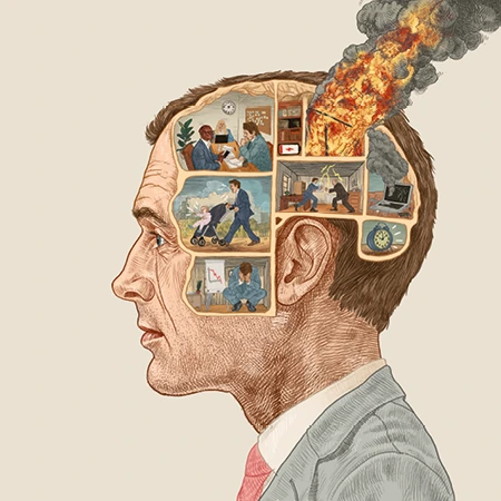 „Zu einem gewissen Grad ist Burn-out tatsächlich gesellschaftlich validiert“, so Burn-out Coach und Professorin für Kulturgeschichte Anna Schaffner. Illustration: Sebastian Haslauer für ARTE Magazin