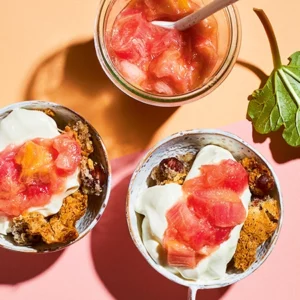 Haselnussbaiser gibt diesem Dessert Crunch und dem säuerlichen Rhabarber die nötige Süße. Dazu die Sahnecreme – himmlisch!