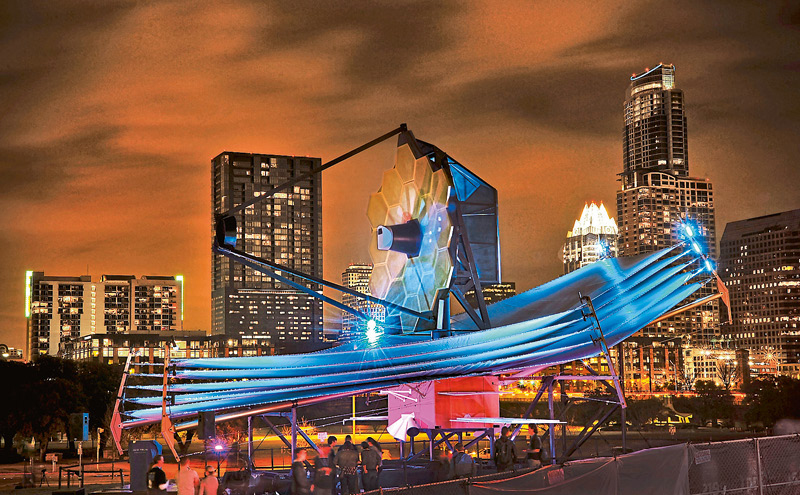 Entsprechend hoch waren die Luftsprünge der Astronautik-Experten, als das JWST als offizieller Nachfolger des 1990 gestarteten Hubble-Teleskops an Bord einer Ariane-5-Trägerrakete die Erde verließ. Um die hochkomplexe Maschine in einer sogenannten Nutzlastkapsel unterzubringen, hatten sich die Konstruierenden ein ausgeklügeltes Faltsystem erdacht: Der Sonnenschild, in der Fläche so groß wie ein Tennisplatz und schwer wie ein Omnibus, sowie die Teleskop-Spiegel wurden nach dem Origami-Prinzip gebaut. Erst im Weltraum brachte ein fast 14 Tage dauernder, vollautomatisierter Prozess die einzelnen Komponenten in ihre endgültige Position. „Dafür mussten Tausende Teile präzise zusammenarbeiten. Ein Wunderwerk der Technik“, unterstrich JWST-Programmdirektor Gregory Robinson. Nach 30 Tagen hatte das Teleskop seine für die Beobachtung des Weltalls vorgesehene Umlaufbahn erreicht: am sogenannten Lagrange-Punkt L2, rund 1,5 Millionen Kilometer von der Erde entfernt. „Vom Teleskop aus gesehen, stehen Sonne und Erde hintereinander und immer in der gleichen Richtung. Blickt man von der Erde zum Teleskop, dann sieht man von ihm stets die gleiche Seite – ähnlich dem Erdmond, der uns nur seine Vorderseite zeigt“, erklärt die Esa und nennt L2 „eine Insel der Stabilität im Weltraum“. Von seiner Umlaufbahn kann das Teleskop im Laufe eines Jahres das gesamte von unserer Galaxie aus sichtbare Universum beobachten, wobei Erde, Mond und Sonne laut Esa im „heißen Rücken“ sind. Die empfindlichen Instrumente auf der Vorderseite befänden sich hingegen immer im Schatten. „Um die von der Sonne und dem Erde-Mond-System kommende thermische Strahlung abzufangen, genügt also ein einziger Schutzschild.“ Bei diesem Wort dürften Science–Fiction-Fans aufhorchen; aber noch gilt es nicht, etwaige Laser-Angriffe abzuwehren. Beim derzeitigen Entwicklungsstand der Technik ist der Weltraum auch ohne gegnerische Raumschiffe für Menschen lebensfeindlich genug.