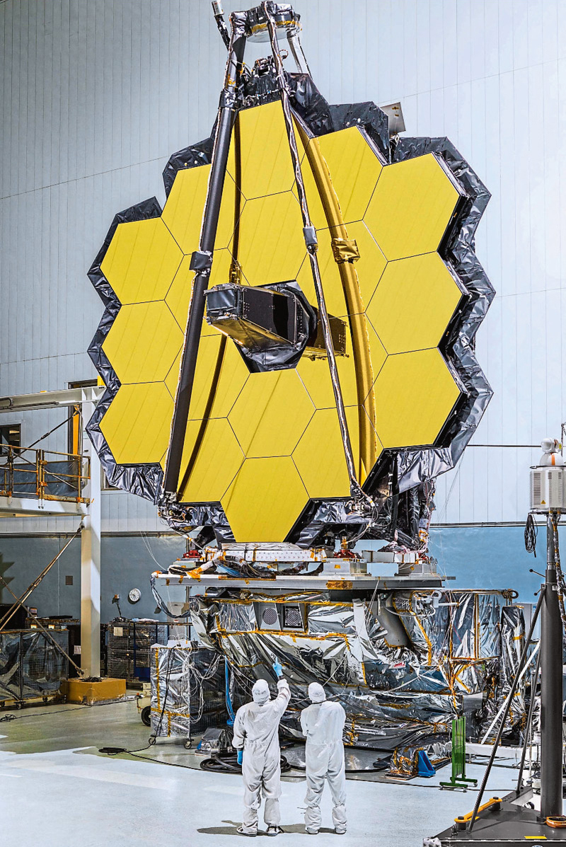 Das James-Webb-Teleskop ist nach dem Origami-Prinzip konstruiert. So umfasst etwa der sogenannte Primärspiegel (Foto) 18 sechseckige Segmente, die mit einer dünnen Gold- und einer vor Einschlägen schützenden Glasschicht überzogen sind. Foto: D.R./PBS/ARTE F