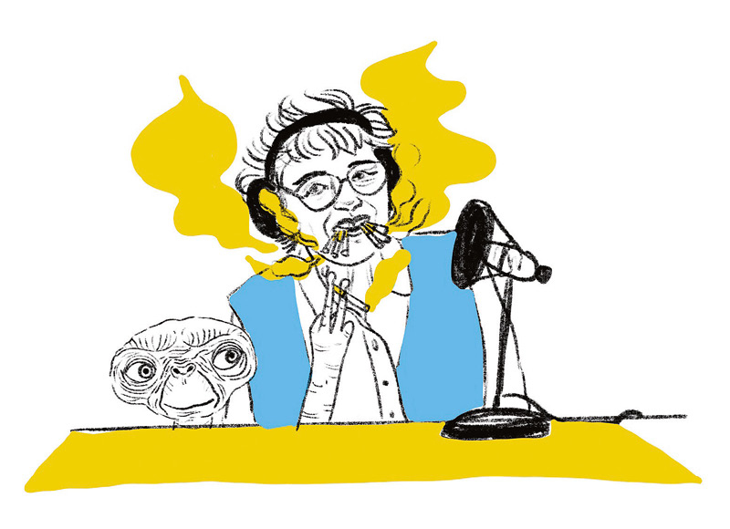 Für E.T.s raue und klangvoll krächzende Stimme wurde Pat Welsh engagiert, eine ältere Dame aus Kalifornien, die sich mit zwei Schachteln Zigaretten pro Tag viele Jahre auf diesen Job vorbereitet hatte. Ihr Einsatz wurde ihr mit einer Gage von 380 US-Dollar gedankt – was ihr bei den damaligen Preisen den Konsum für die nächsten drei Monate sicherte. Illustration: Sarah Matuszewski