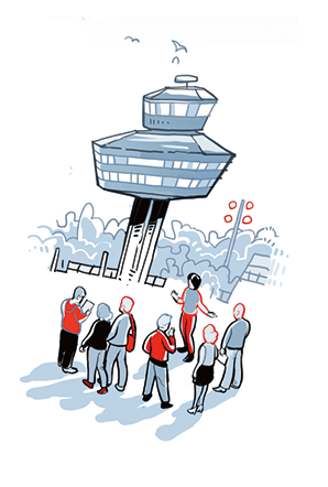 Illustration einer Menschengruppe vor dem Flughafen-Funkturm Alt-Tegel