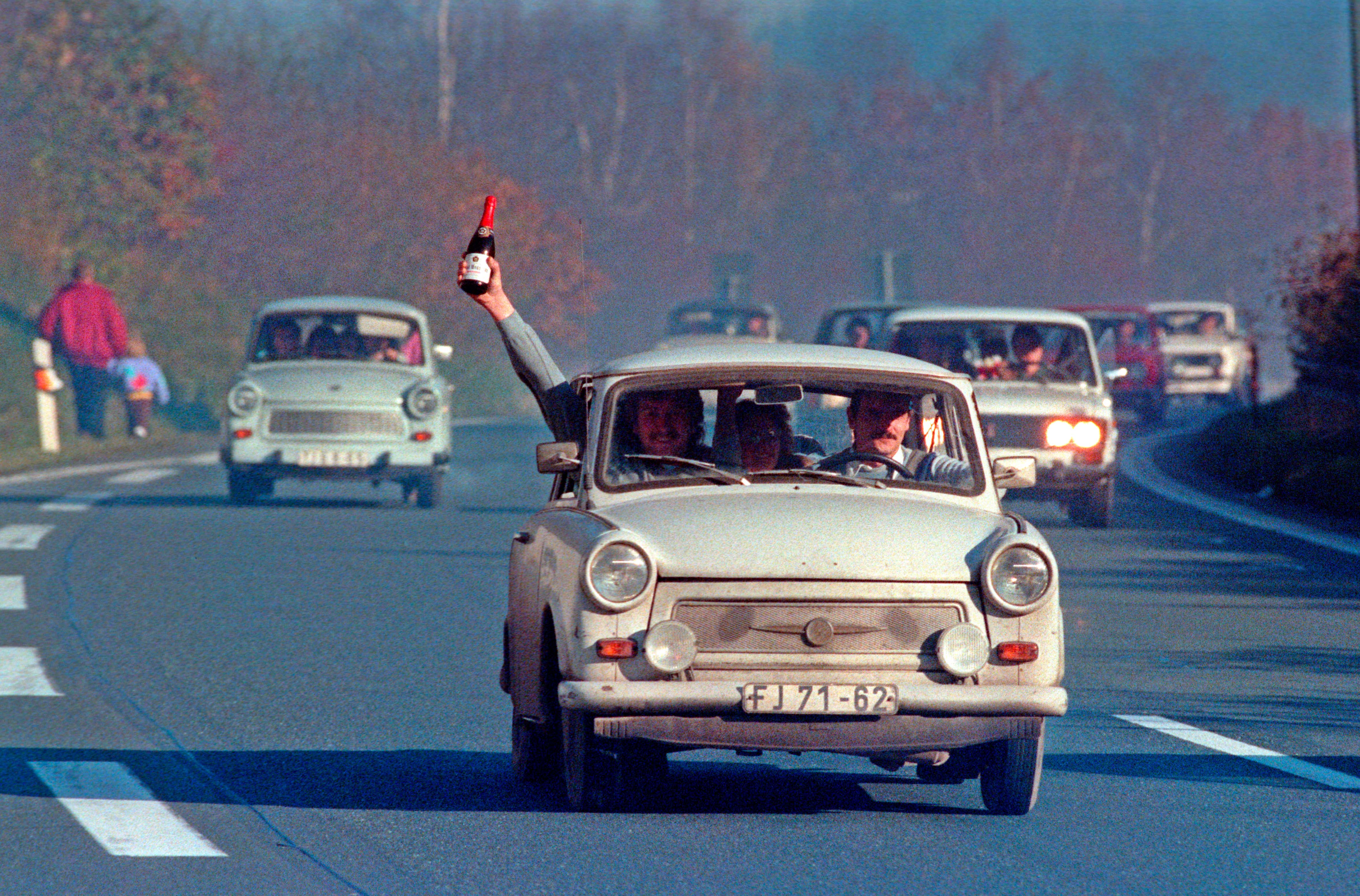 Nach der Grenzöffnung am 9. November 1989 rollen Trabbis Richtung Bayern. Foto: Sven Creutzmann/Mambo photo/Getty Images