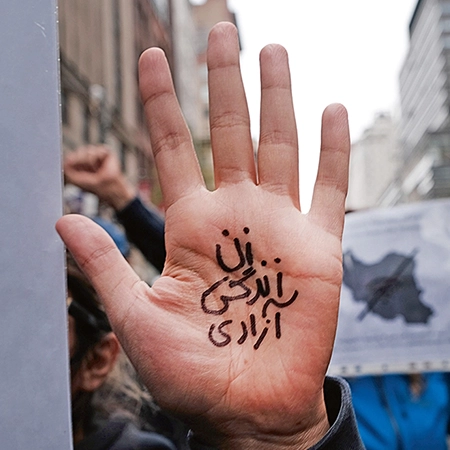 Frau, Leben, Freiheit: Die feministische Parole, hier in persischer Sprache auf eine Handinnenfläche geschrieben, hat ihren Ursprung in der kurdischen Freiheitsbewegung. Foto: Spencer Platt/Getty Images.