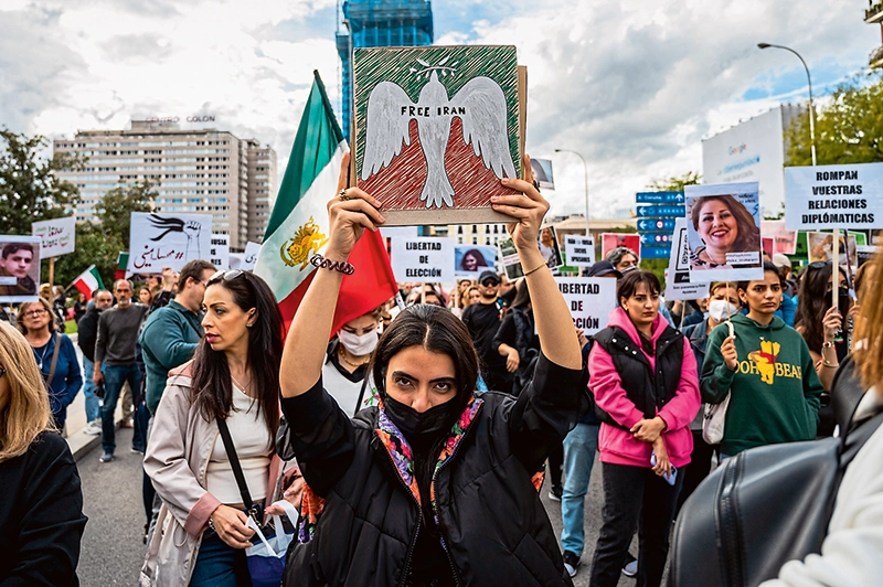 Nach dem Tod von Jina Mahsa Amini im Jahr 2022 protestierten Menschen weltweit auf den Straßen – so auch in Madrid. Foto: Marcos del Mazo/LightRocket/Getty Images