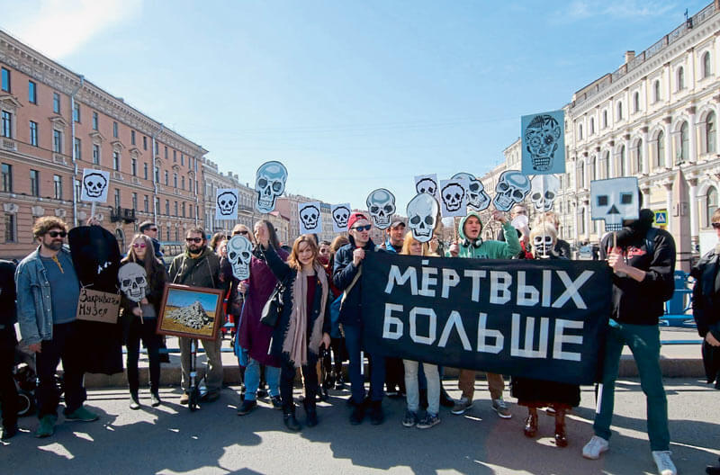 Kriegsgegner in Russland halten ein Plakat mit der Aufschrift: „Es gibt mehr Tote“. Foto: Party of the Dead/ZDF