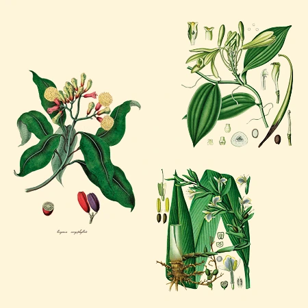Jedes Gewürz birgt eine einzigartige Geschichte: Vanilleblüten werden in Mexiko aufwendig per Hand bestäubt, die Kardamom-Plantagen Indiens liegen im dichten Dschungel und die Inselgruppe der Molukken war als exklusive Quellen für Nelken und Muskat einst Auslöser für Kriege. Illustration: Florilegius/Universal Images Group/Getty Images