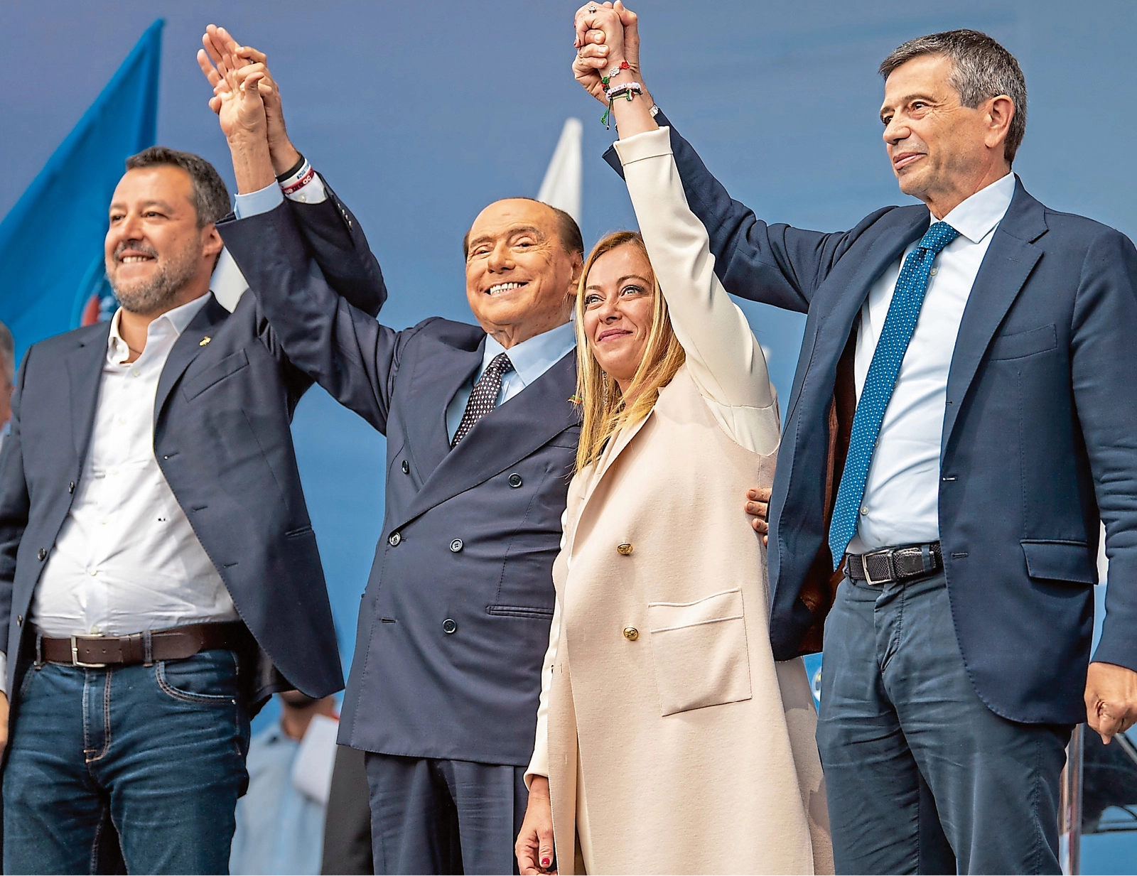 Der Durchbruch kam schließlich in einer Zeit voller Krisen – allen voran die Corona-Pandemie, der Krieg in der Ukraine sowie eine hohe Inflation. Bei der Parlamentswahl 2022 wurde ihre Partei mit rund 26 Prozent stärkste Kraft und sicherte sich gemeinsam mit der rechtspopulistischen Lega und der konservativen Forza Italia die Mehrheit im Parlament. Meloni wurde Ministerpräsidentin – als erste Frau in der Geschichte Italiens und als erste Politikerin mit postfaschistischen Wurzeln an der Spitze einer europäischen Demokratie. Eine klare Distanzierung vom Faschismus gehört bei ihr nicht zum politischen Repertoire. Benito Mussolini sei „eine vielschichtige Person“ gewesen, sagt Meloni, unter ihm habe es „auch Gutes“ gegeben. Auch im Erscheinungsbild ihrer Partei bleiben Spuren dieser Vergangenheit sichtbar: Das Logo der Fratelli d’Italia zeigt eine stilisierte Flamme in den Farben der Trikolore, verstanden als Anspielung auf die sogenannte ewige Flamme am Grab Mussolinis.