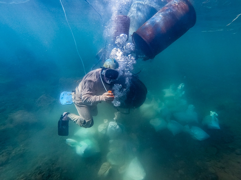 Taucher lagern Goldsand in Säcken unter Wasser