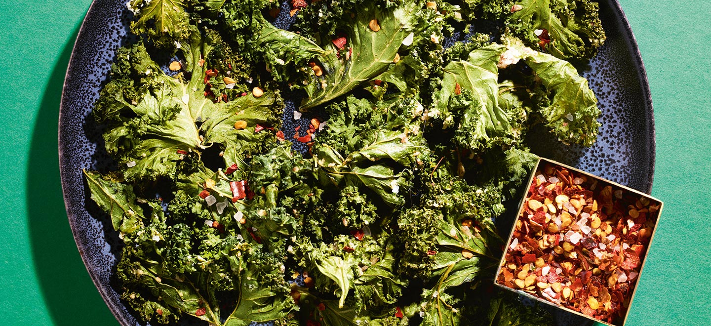 Aber gekochter Kohl mit fettiger Wurst? Umso neugieriger wurde ich, als ich die „Zu Tisch“-Sendung aus dem Oldenburger Land sah. Ich erfuhr, dass der Vitamin-C-haltige Kohl als „Trendgemüse“ firmiert und zu Eis und sogar Pralinen verarbeitet wird. Besonders angetan hat es mir aber Biobauer Peter Kluin. Er baut seltene Grünkohl-Sorten wie Lerchenzunge oder Schwarzkohl an, seine Frau Susanne Bruns macht daraus grüne Smoothies, süße Aufläufe – und gesunde Chips: Backofen auf 100 Grad Umluft vorheizen. Grünkohl waschen und trocken schleudern.