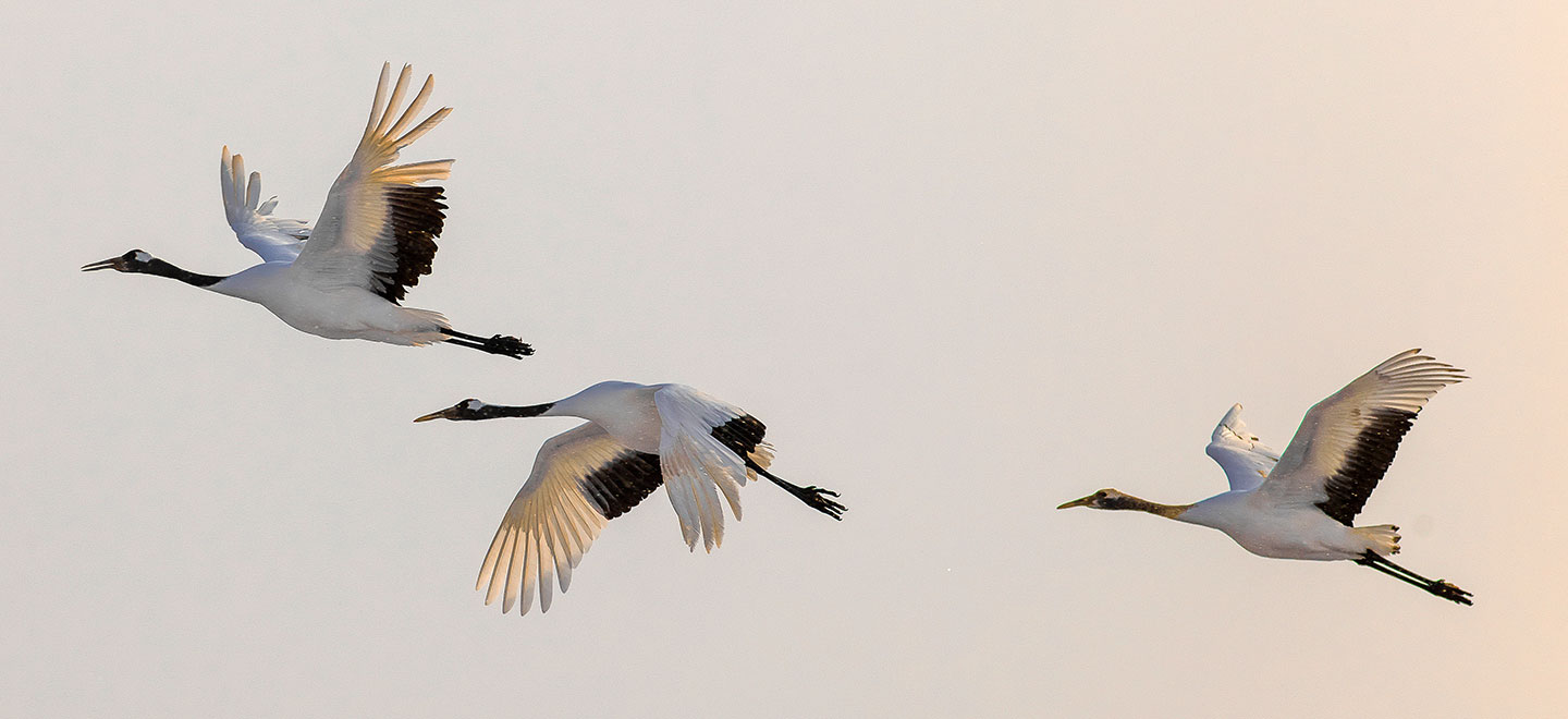 Lange Stelzenbeine staksen umher, schwarz-weiße Flügel flattern im Schnee – die Japankraniche, Mandschurenkraniche genannt, verkörpern wie kein zweites Tier das japanische Element der „Luft“. Ihm werden im Inselstaat übernatürliche Eigenschaften nachgesagt. Luft gilt als unberechenbar, mal als dem Menschen wohlgesinnt, mal als tückisch und gefährlich. Jedoch immer ungreifbar und dadurch mystisch. Ein leichter Wind kann eben innerhalb kurzer Zeit zu einem todbringenden heranwachsen. Die anmutigen und eleganten Bewegungen der Kraniche – immer wieder unterbrochen durch Anflüge eines wilden, gefiederten Tanzes – verkörpern diese Ambivalenz aus Sicht der Japaner. Männchen und Weibchen der Kraniche sehen identisch aus, sie unterscheiden sich nur durch ihre Rufe bei der Paarung. Einmal einander gefunden, bleiben die Vögel ein Leben lang zusammen, um gemeinsam von den Winden mit viel Leichtigkeit über die Inseln getragen zu werden. In Japan galten sie lange als ausgestorben – inzwischen werden sie von fürsorglichen Bewunderern ihrer Anmut umsorgt. Ohne die Menschen, die auf die zarten Vögel achtgeben, kämen sie nicht durch den Winter.