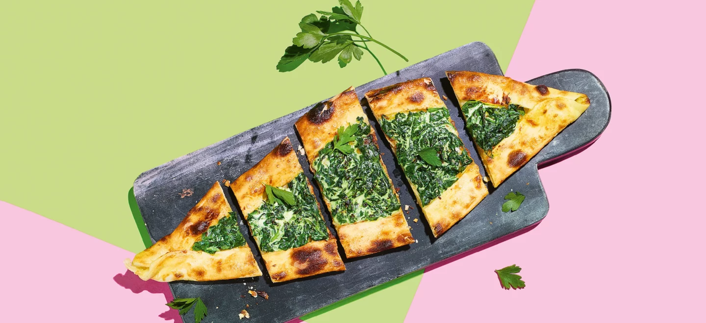 Dünnes Pita-Brot soll im antiken Griechenland entstanden sein und gehört damit zu den ersten Brotsorten, die jemals hergestellt wurden. Die türkische Schwesternvariante besteht aus Hefeteig, ist ein wenig dicker und wird mit unterschiedlichen Belägen zubereitet, meist mit pikantem Rinderhackfleisch oder deftiger Knoblauchwurst – es gibt aber auch eine vegetarische Spinat-Feta-Kombination: Die frische Hefe zerbröseln und mit einem Teelöffel Zucker in etwas lauwarmem Wasser auflösen. Einige Minuten ruhen lassen. Das Mehl in eine große Schüssel sieben. Die aufgelöste Hefe dazugeben und mit den übrigen Zutaten verkneten, bis ein elastischer Teig entstanden ist. Ist der Teig zu klebrig, noch etwas Mehl dazugeben. Den Teig ca. eine Stunde abgedeckt an einem warmen Ort ruhen lassen. Währenddessen die Füllung zubereiten.