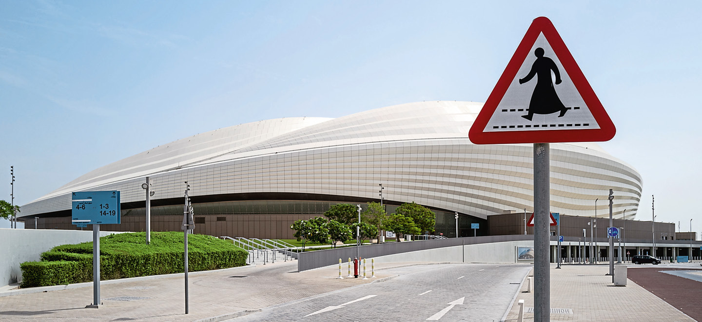 Das Al-Janoub-Stadion wurde von Architektin Zaha Hadid entworfen. Es ist eine von acht Arenen für die Fußball-Weltmeisterschaft in Katar. Ihr Bau wird von zahlreichen Menschenrechtsverletzungen überschattet. Foto: Matthew Ashton / AMA / Getty Images