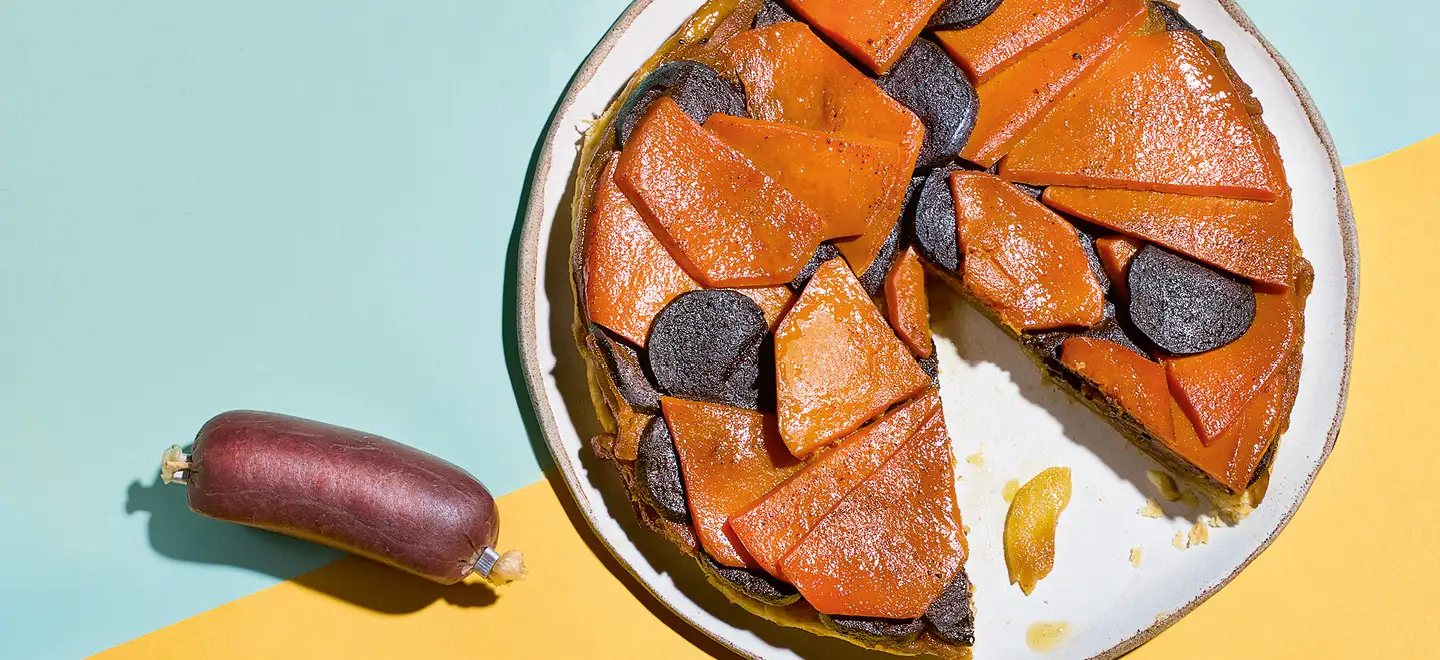 In welchem Land Europas schlürfen Sportler nach dem Training im Vereinsheim erst mal ein paar Austern, bevor sie sich über ein à la minute zubereitetes Garnelen-Kürbis-Curry hermachen? Sie kennen die Antwort: in Frankreich, bien sûr. In Deutschland, dem Würstchen-mit-Kartoffelsalat-Land, wäre das undenkbar. Jedenfalls habe ich mir die „Zu Tisch“-Episode über den Gemüsebauern und Hobby-Rugbyspieler Benjamin Caïe mit großem kulinarischem Vergnügen angesehen. Ein Gericht, das bei Familie Caïe öfter auf den Tisch kommt, hat es mir besonders angetan: eine simple Tarte mit einem Belag aus Kürbis, Äpfeln und Blutwurst. Letztere – auf Französisch heißt sie „boudin“ – ist eine Delikatesse, wenn sie von hoher Qualität ist.
