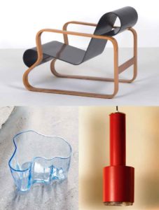 Oben: Bereits 1932 entwarf Alvar Aalto den rundherum runden Paimio Chair. Links: Die Savoy-Vase, auch Aalto-Vase genannt. Rechts: Die Lampe A110 von 1952 bekam den Spitznamen „Handgranate“. Fotos: Maija Holma/Alvar Aalto Foundation
