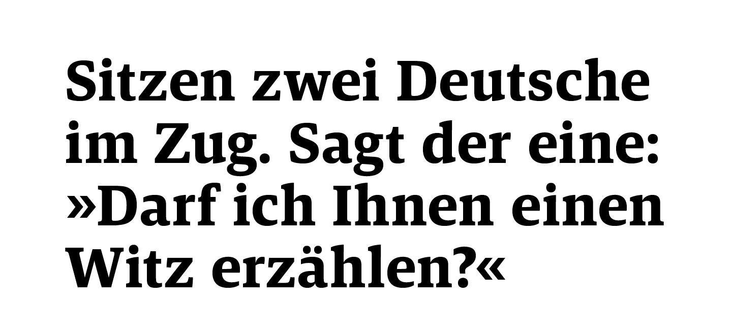 Sitzen zwei Deutsche im Zug. Sagt der eine: „Darf ich Ihnen einen Witz erzählen?“ Antwortet der andere: „Nein, danke, ich werde ihn wahrscheinlich nicht verstehen.“ „Oh“, sagt der Erste, „Entschuldigung, ich dachte, Sie wären auch jüdisch.“