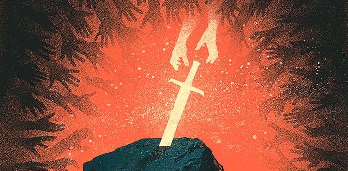 Wunderwaffe: Das Schwert, je nach Legendenfassung Excalibur oder Caliburn, konnte nur Artus als rechtmäßiger Herrscher Britanniens aus dem Felsblock ziehen. Illustration: Kristen und Kevin Howdeshell/The Brave Union