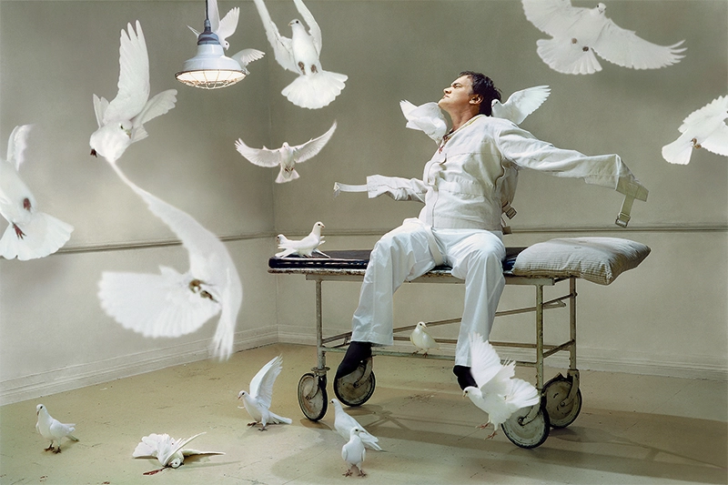 Quentin Tarantino fotografiert von Martin Schoeller mit weißen Tauben