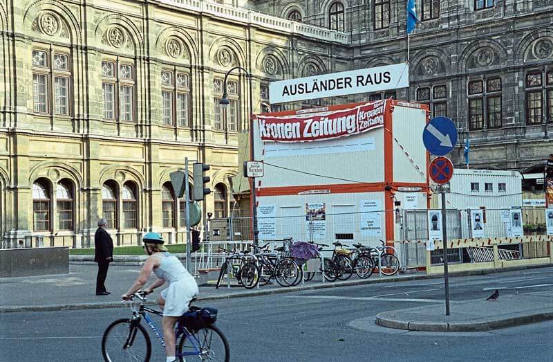 Christoph Schliengensiefs Wiener Container-Projekt „Ausländer raus!“. Foto: Didi Sattmann / IMAGNO / picture alliance