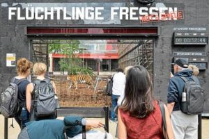 Auf den Spuren von Christoph Schlingensief – das radikale Künstlerkollektiv Zentrum für politische Schönheit mit der Aktion „Flüchtlinge fressen“ im Jahr 2016. Foto: Maurizio Gambarini / picture alliance