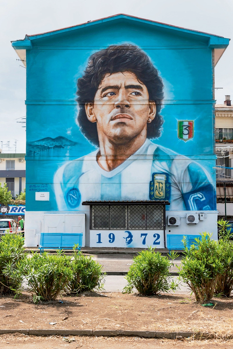 Der argentinische Fußballgott Diego Maradona (r.) wird in Neapel verehrt, zu sehen auf vielen Hauswänden der Stadt. Foto: Jonathan Moscrop / Getty Images