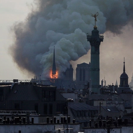 Eine gewaltige Rauchsäule steht über dem Sakralbau. Über Stunden schlugen Flammen aus dem Gebäude. Foto: Matthias Wagner / picture alliance / dpa