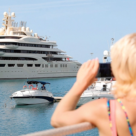 Reichtum: Luxusjachten zählen zu den beliebten Statussymbolen von Oligarchen. Die „Dilbar“ soll dem von der EU sanktionierten Milliardär Alischer Usmanow gehören und wurde 2022 in Hamburg von den Behörden festgesetzt. Usmanow erwirkte inzwischen die Aufhebung des Beschlusses. Foto: Vyacheslav Prokofyev / picture alliance / dpa