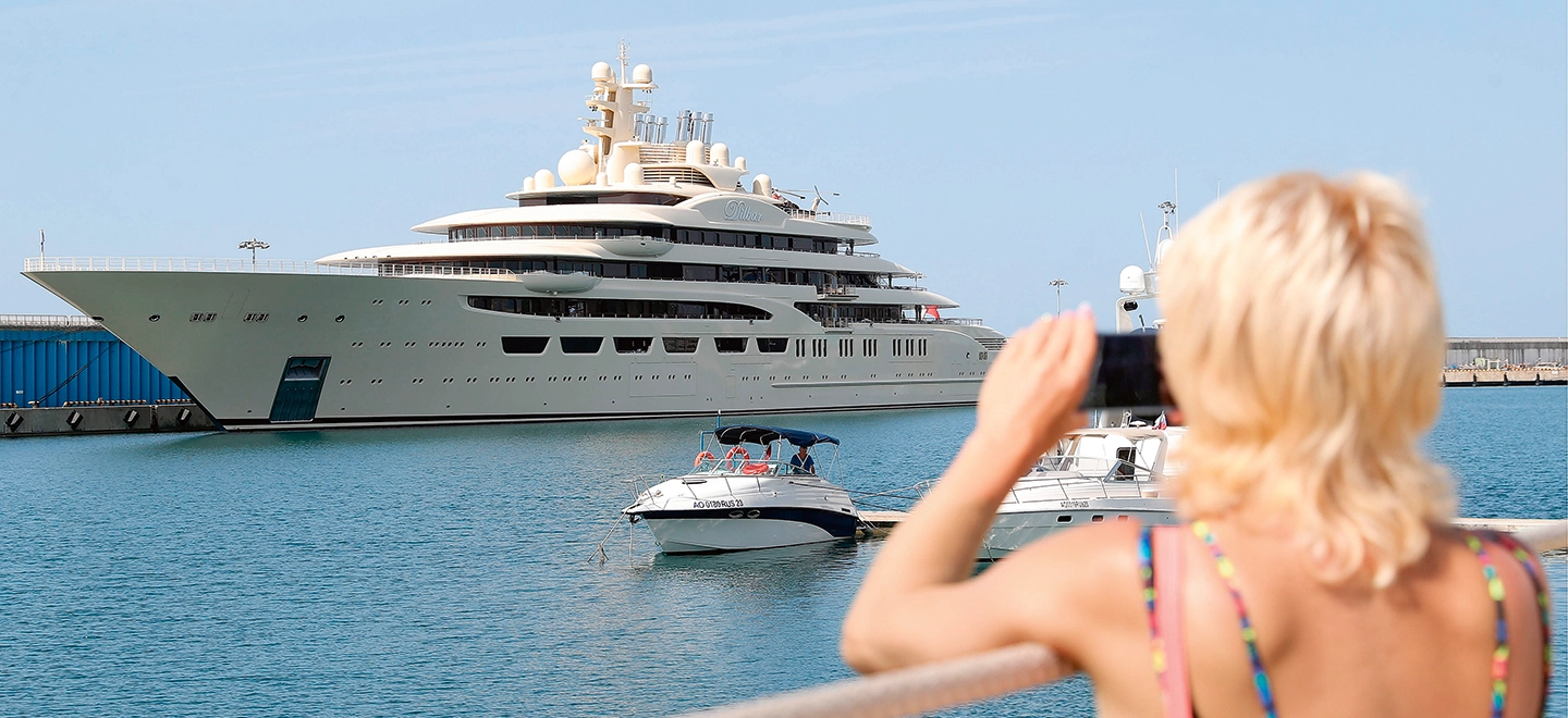 Reichtum: Luxusjachten zählen zu den beliebten Statussymbolen von Oligarchen. Die „Dilbar“ soll dem von der EU sanktionierten Milliardär Alischer Usmanow gehören und wurde 2022 in Hamburg von den Behörden festgesetzt. Usmanow erwirkte inzwischen die Aufhebung des Beschlusses. Foto: Vyacheslav Prokofyev / picture alliance / dpa