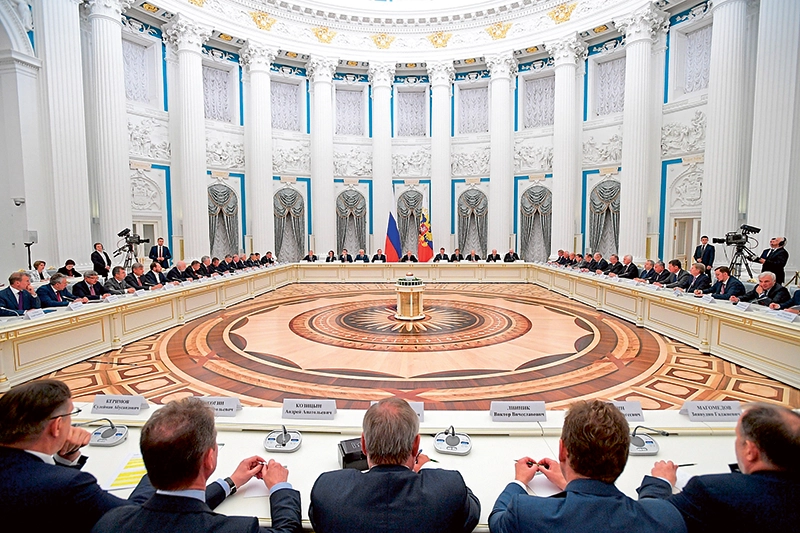 Tafelrunde: Um führende Industrielle und Unternehmenslenker auf Kurs zu bringen, empfängt Russlands Machthaber Wladimir Putin sie regelmäßig im Kreml. Das Bild zeigt eines dieser Treffen im September 2018. Im Februar 2022, am Tag des Überfalls auf die Ukraine, schwor Putin sie erneut auf sich ein. Foto: Alexei Druzhinin / picture alliance / AP Images