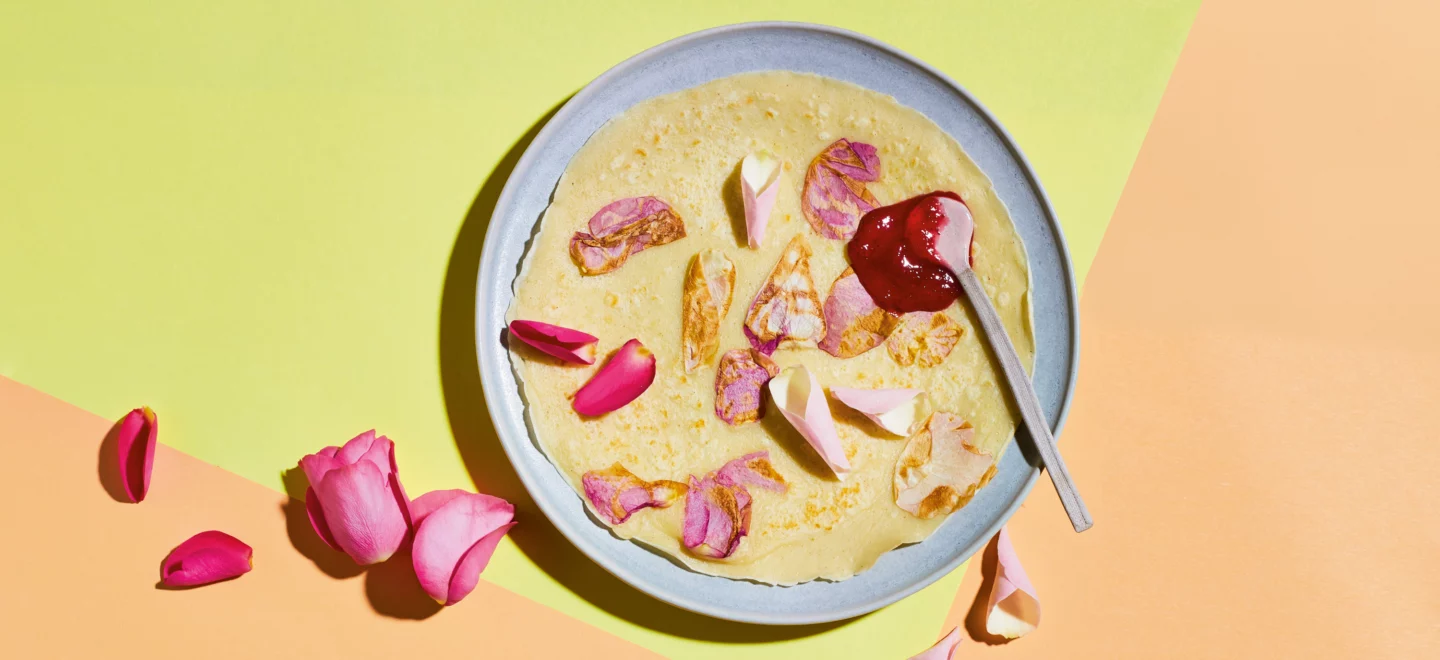 Die Rosenmarmelade habe ich mir mangels geeigneter Zutaten fertig besorgt, aber die Palatschinken gelingen so: Die Eier in einem Topf mit dem Mixer gut verschlagen. Die Milch hinzufügen, Joghurt und Backpulver separat verrühren und hinzugeben, dann nach und nach das Mehl sowie eine Prise Salz, den Vanillezucker und den Saft der halben Zitrone dazugeben. Zuletzt das Mineralwasser hinzufügen. So lange weiter mixen, bis ein cremiger Teig entstanden ist. Ist der Teig zu dünn, ein wenig Mehl hinzufügen, ist er zu dickflüssig, mit etwas Milch verdünnen. Eine Eisenpfanne erhitzen, einen Klecks Öl oder Butter hineingeben und verteilen, dann eine Suppenkelle voll Teig in die Pfanne fließen lassen und durch Schwenken gleichmäßig verteilen. Die Temperatur reduzieren. Sobald der Palatschinken leicht gebräunt ist und sich von der Pfanne löst, wenden und die zweite Seite bräunen lassen. Auf den fertigen Palatschinken ein paar Butterflocken verteilen und auf einen Teller gleiten lassen. Erneut die Pfanne einfetten und die Prozedur wiederholen. Dobăr apetit!