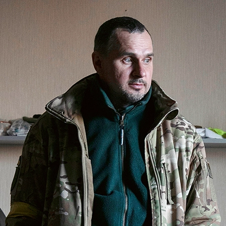Sein Leben ist geprägt von Gewalt und Grausamkeiten, doch das will er ändern. Regisseur Oleg Sentsov im März 2022, kurz nach dem Beitritt zum Militär. Foto: Laurent Van der Stockt / Le Monde / Getty Images