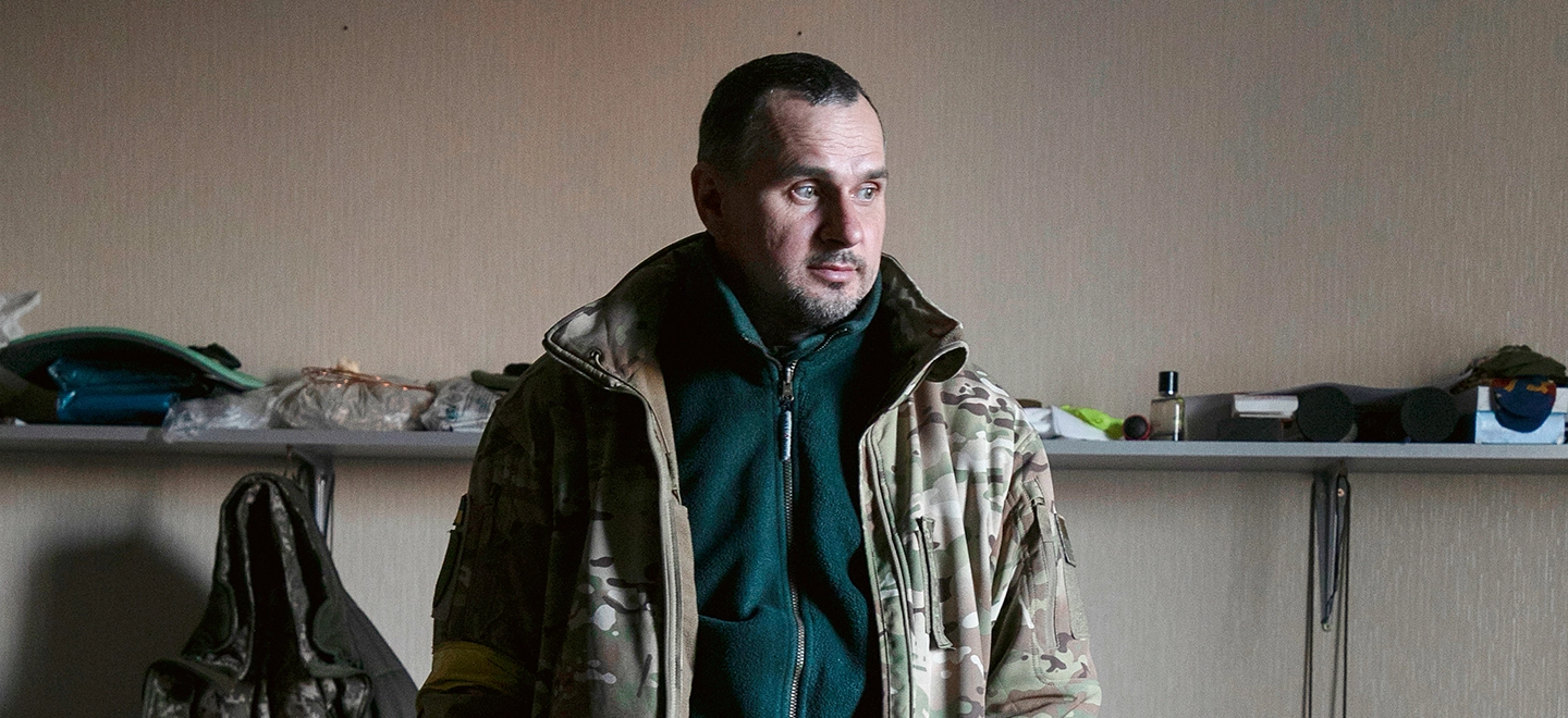 Sein Leben ist geprägt von Gewalt und Grausamkeiten, doch das will er ändern. Regisseur Oleg Sentsov im März 2022, kurz nach dem Beitritt zum Militär. Foto: Laurent Van der Stockt / Le Monde / Getty Images