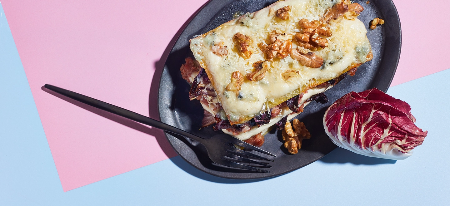 Lasagne auf einem Teller mit Walnüssen dekoriert