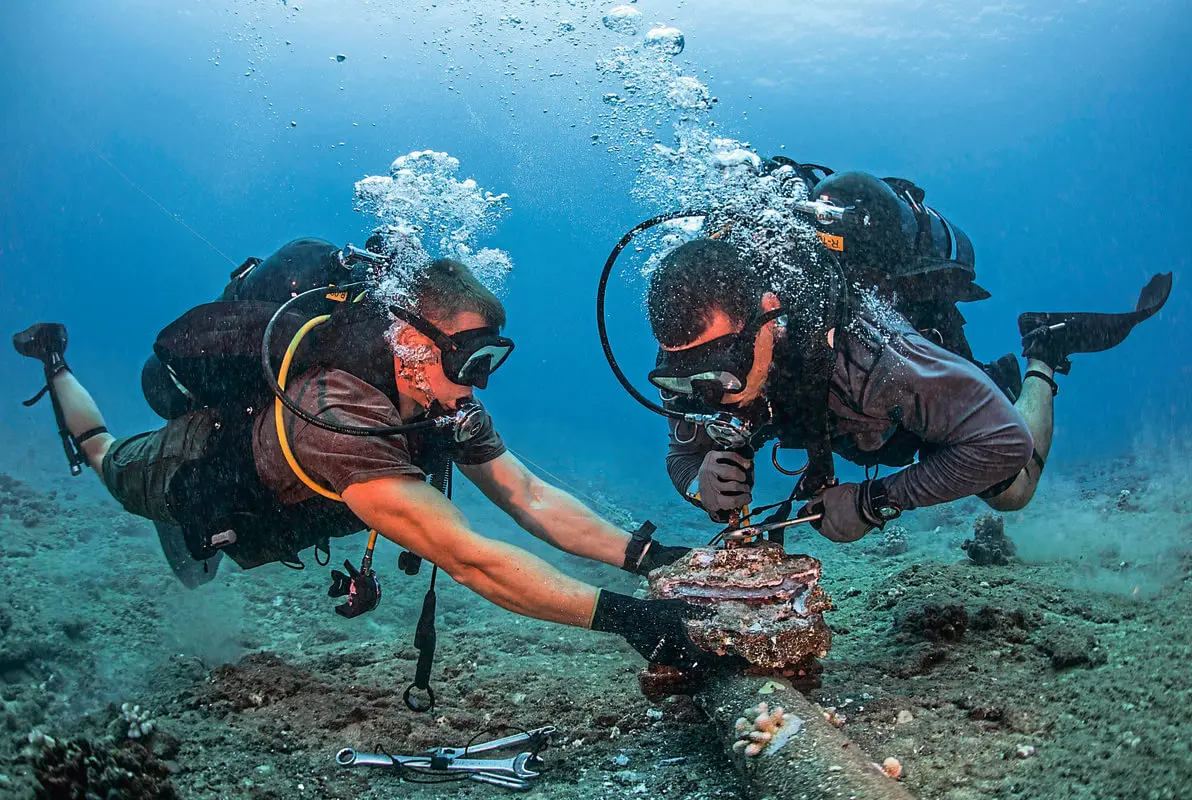 Taucher der US Navy kontrollieren den Zustand eines Datenkabels unweit der Marinebasis Barking Sands im Pazifik. Foto: AB Forces News Collection / Alamy / mauritius images
