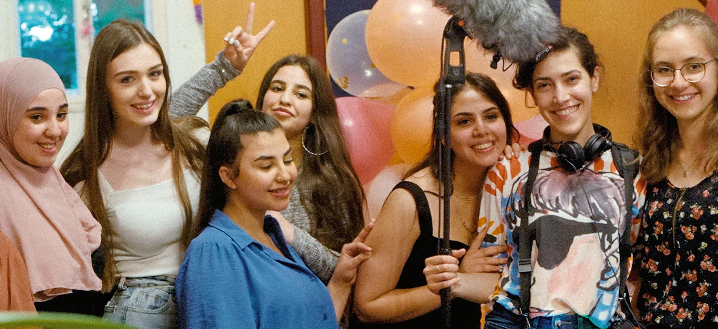 Humorvoll und mit viel Empathie spürt Regisseurin Rand Beiruty (2. v. R.) den Träumen und Sehnsüchten einer Gruppe von Teenagerinnen in der deutschen Provinz nach. Das Foto zeigt die Filmemacherin mit den Jugendlichen auf einer Geburtstagsfeier. Foto: Marco Müller/RBB