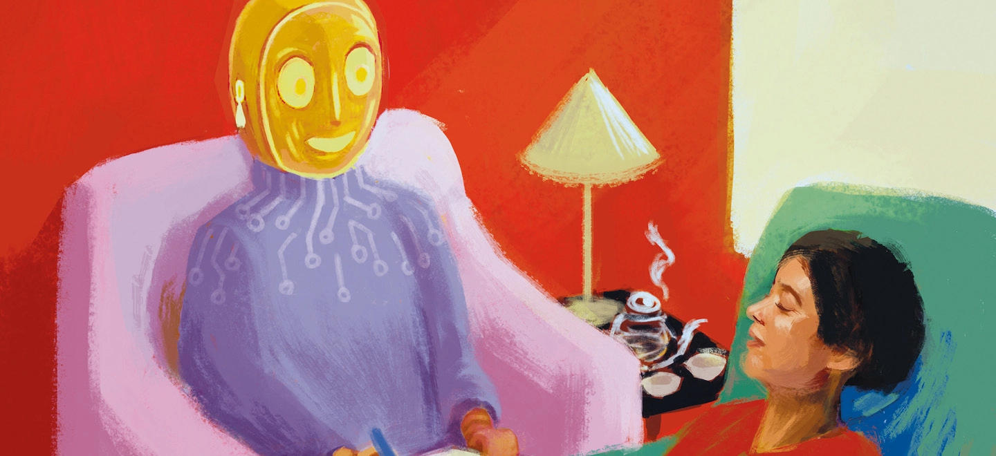 Bei vielen psychischen Erkrankungen besteht akuter Handlungsbedarf, doch Therapeuten stoßen an Belastungsgrenzen. Inwieweit können KI-Apps und Chatbots helfen? Illustration: Mona Eing und Michael Meissner