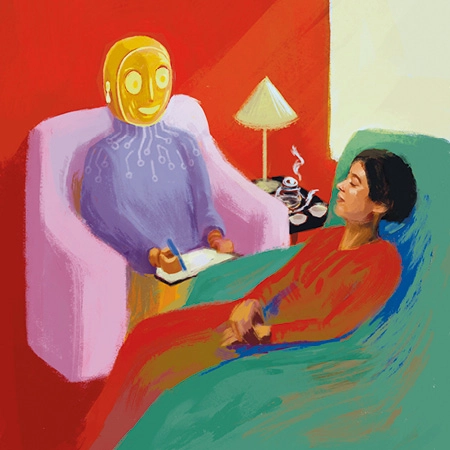 Bei vielen psychischen Erkrankungen besteht akuter Handlungsbedarf, doch Therapeuten stoßen an Belastungsgrenzen. Inwieweit können KI-Apps und Chatbots helfen? Illustration: Mona Eing und Michael Meissner