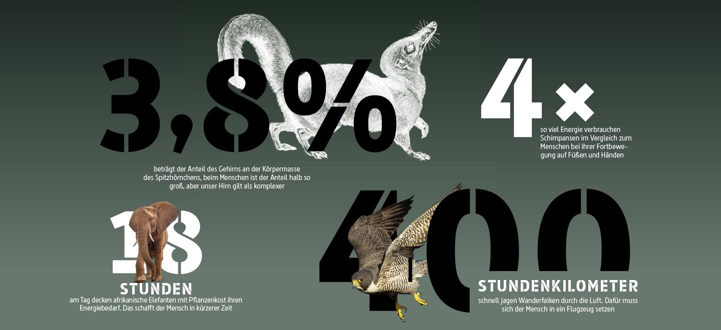 Als der Schweizer Verein Philosophie.ch auf seinem gleichnamigen Online-Portal vor einigen Jahren Blogbeiträge zum Thema „Mensch“ sammelte, zitierten gleich mehrere Wissenschaftler den Humoristen Loriot: „Der Mensch ist das einzige Wesen, das im Fliegen eine warme Mahlzeit zu sich nehmen kann.“ Ganz ernst gemeint war das nicht, aber es illustriert den Stand der Debatte auch nach einigen Tausend Jahren des Nachdenkens. Denn wann immer ein Kriterium – Sprache, Sozialverhalten, Vernunftbegabung oder Leidensfähigkeit beispielsweise – als Maßstab für die Unterscheidbarkeit diente, gab und gibt es Rede und Gegenrede. Kompliziert sind die Dinge allein dadurch, dass wir Kompetenzen und Handlungsweisen von Mensch und Tier zwangsläufig aus nur einer Perspektive betrachten – anthropozentrisch eben. Immerhin: Unsere Fähigkeiten zur Abstraktion, zur Rückbesinnung und zur Weitergabe kulturellen Wissens gelten als singulär und wesentliche Faktoren für die stete Verbesserung einmal erlernter Techniken von Menschengeneration zu Menschengeneration.